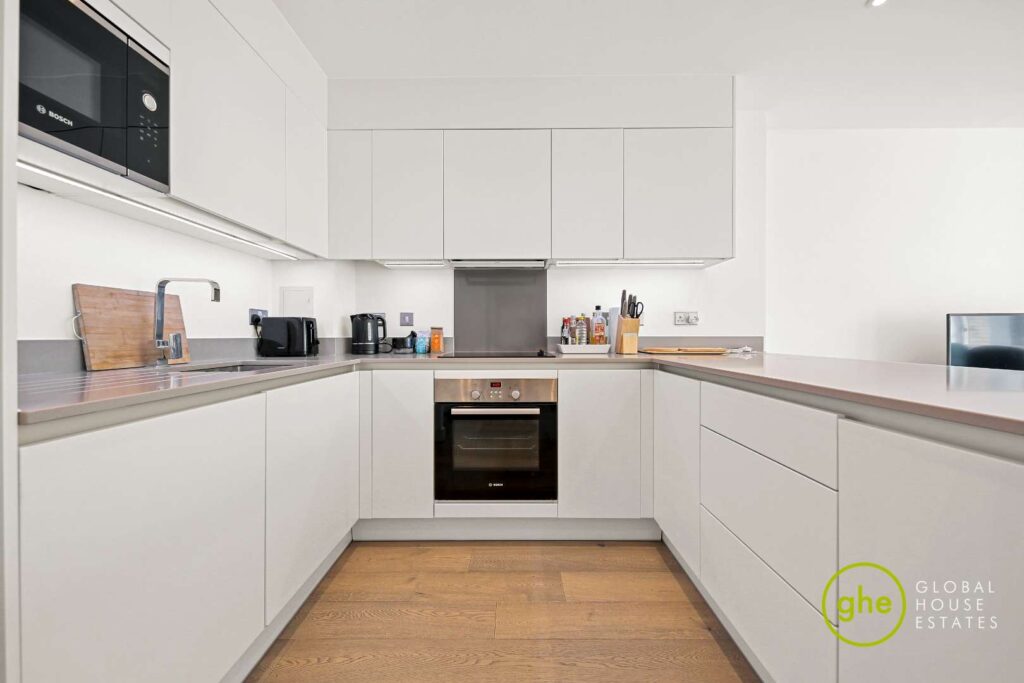 Upon entering, you are welcomed by a bright and spacious open-plan living area. Floor-to-ceiling windows flood the space with natural light, while elegant wooden flooring adds warmth and sophistication throughout. The fully fitted kitchen is seamlessly integrated, complete with quality appliances, creating a stylish and functional living environment.